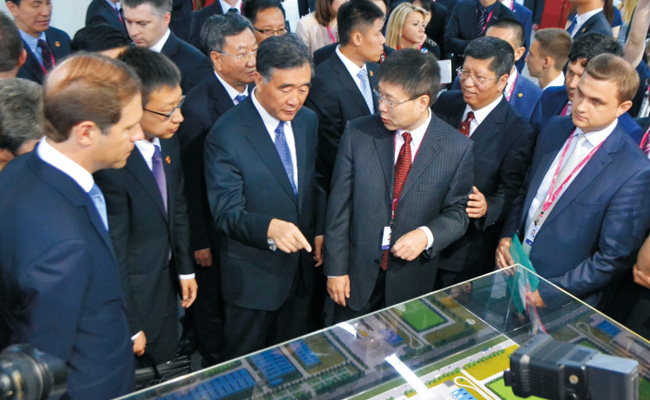 2015年7月8日,中央政治局委员、国务院副总理汪洋访问俄罗斯时,观看力帆利佩茨克汽车工厂项目沙盘。